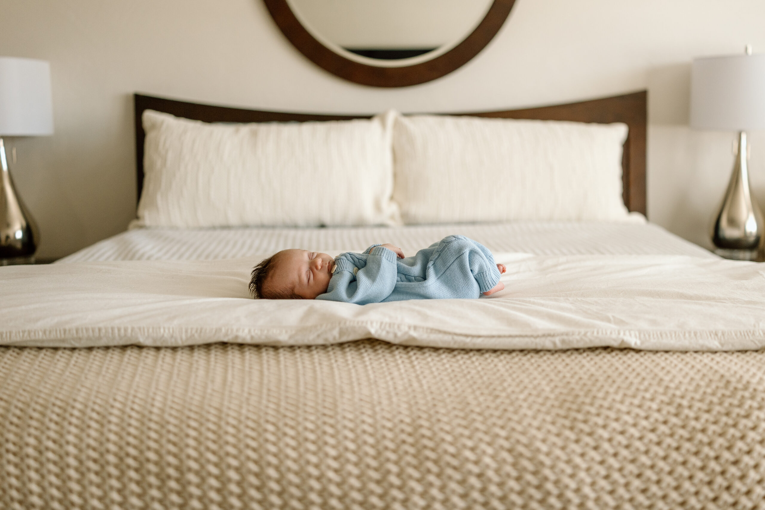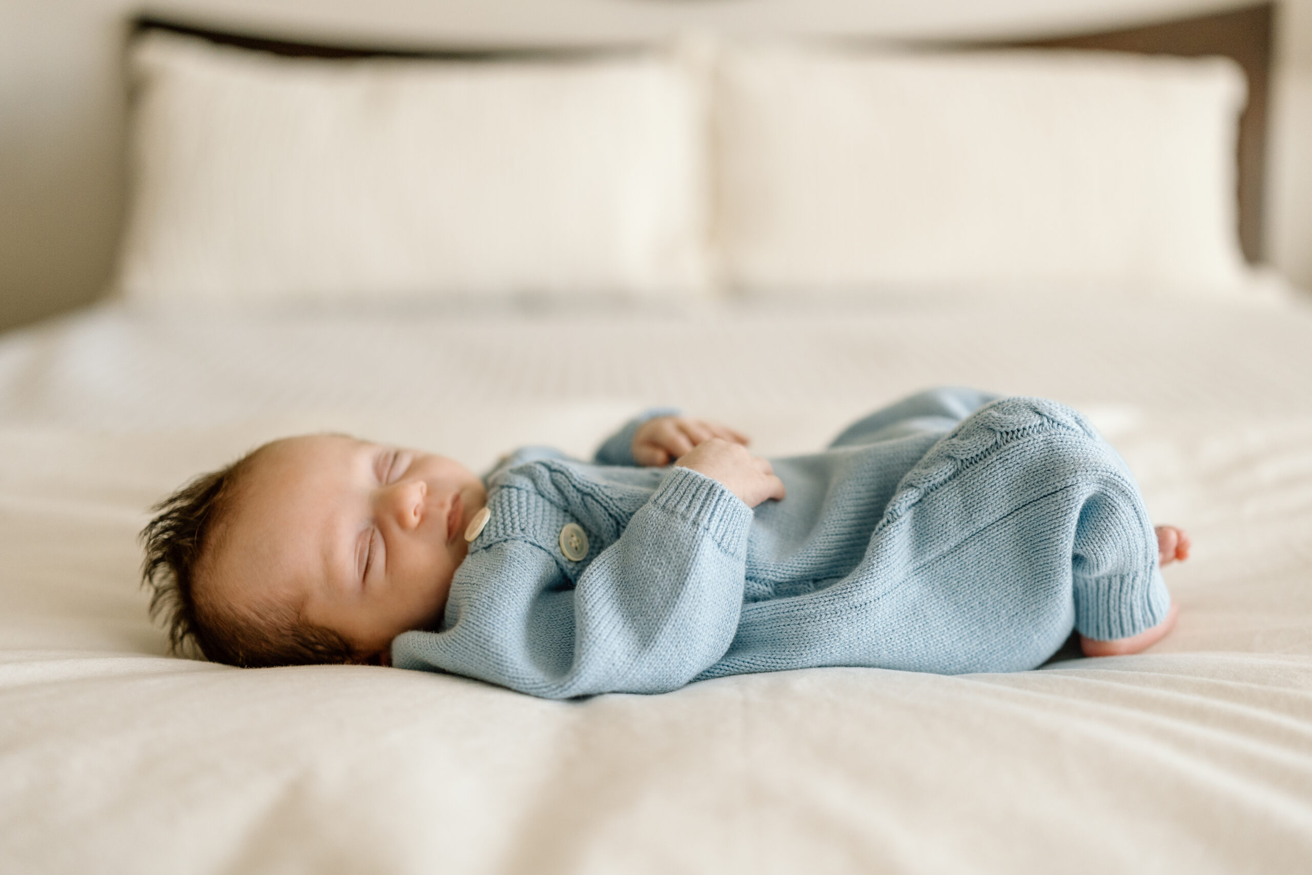 Texture Over Prints: Notice how the knit texture on this blue romper adds depth without being distracting? Knits, linens, and gauzy cottons photograph beautifully and move naturally with the baby.