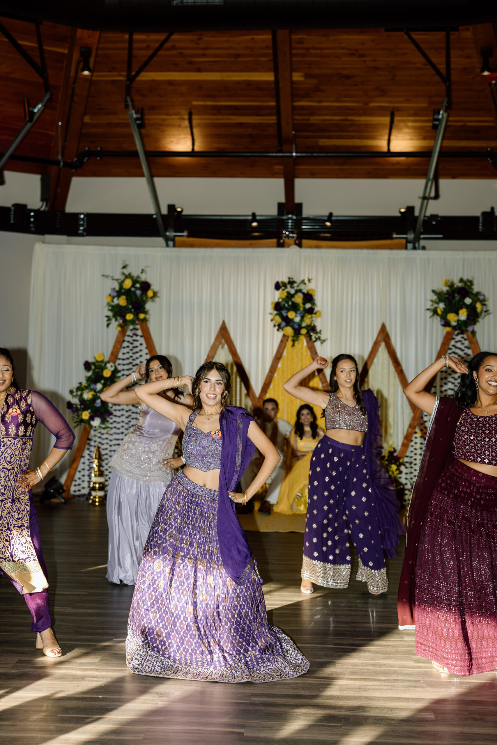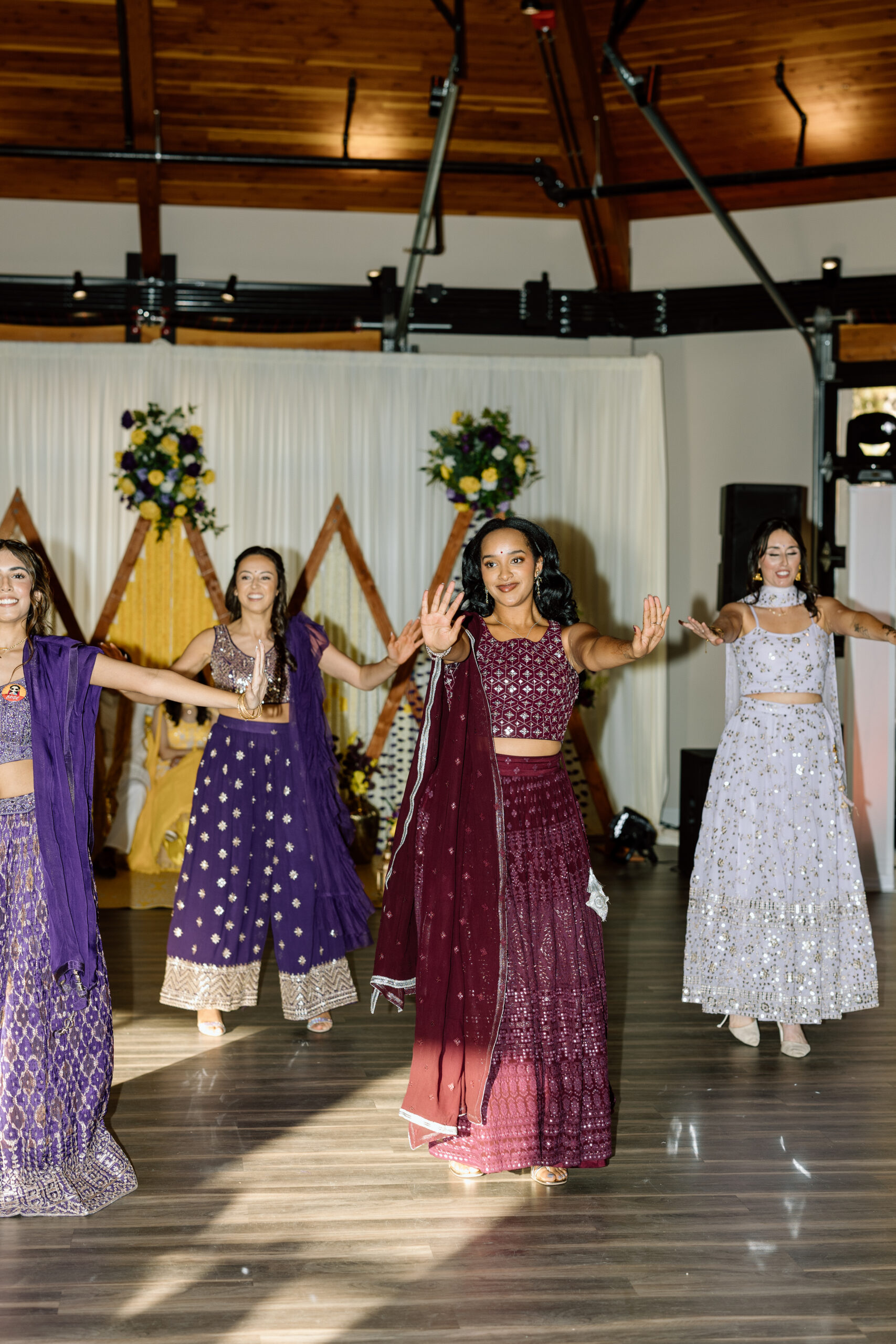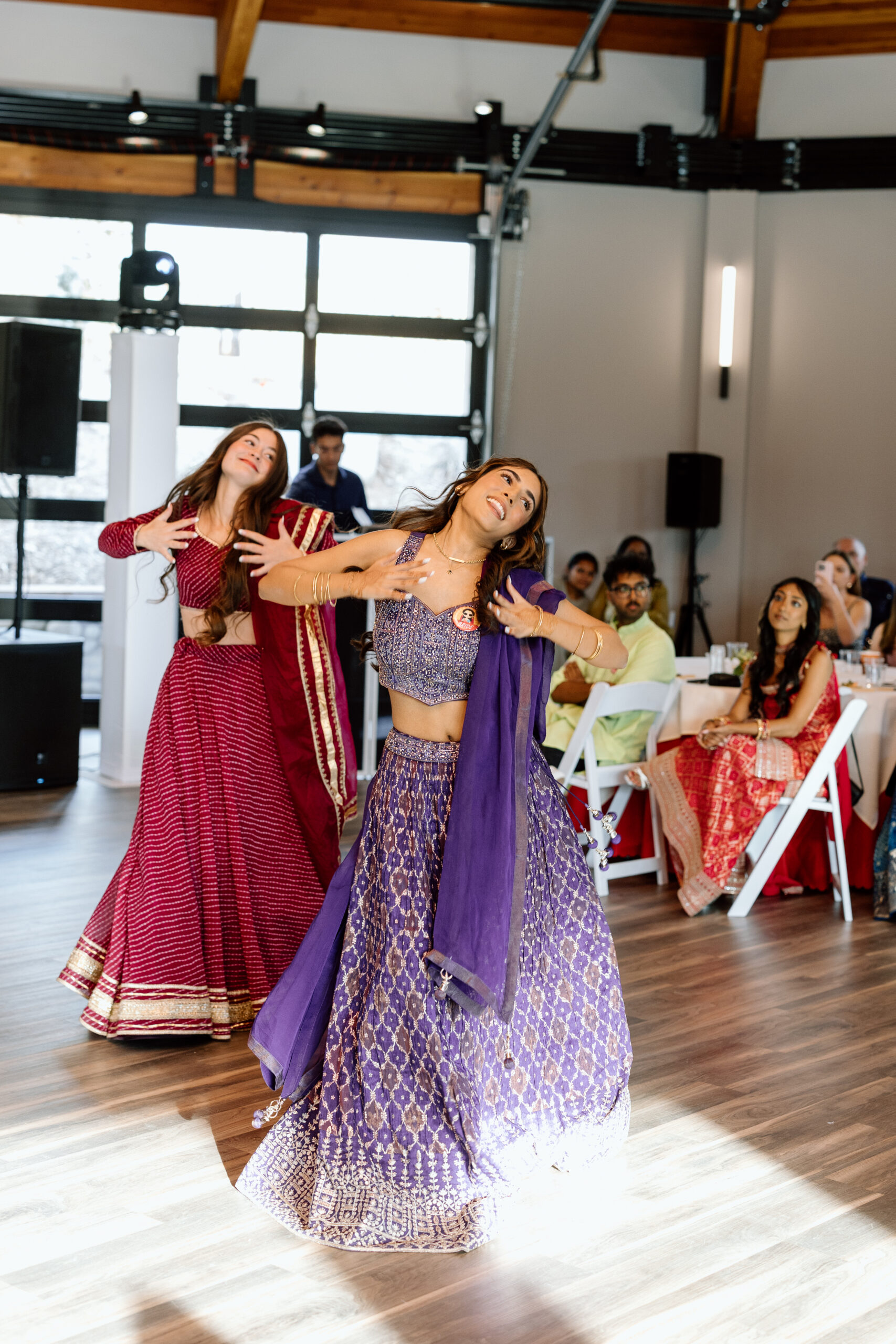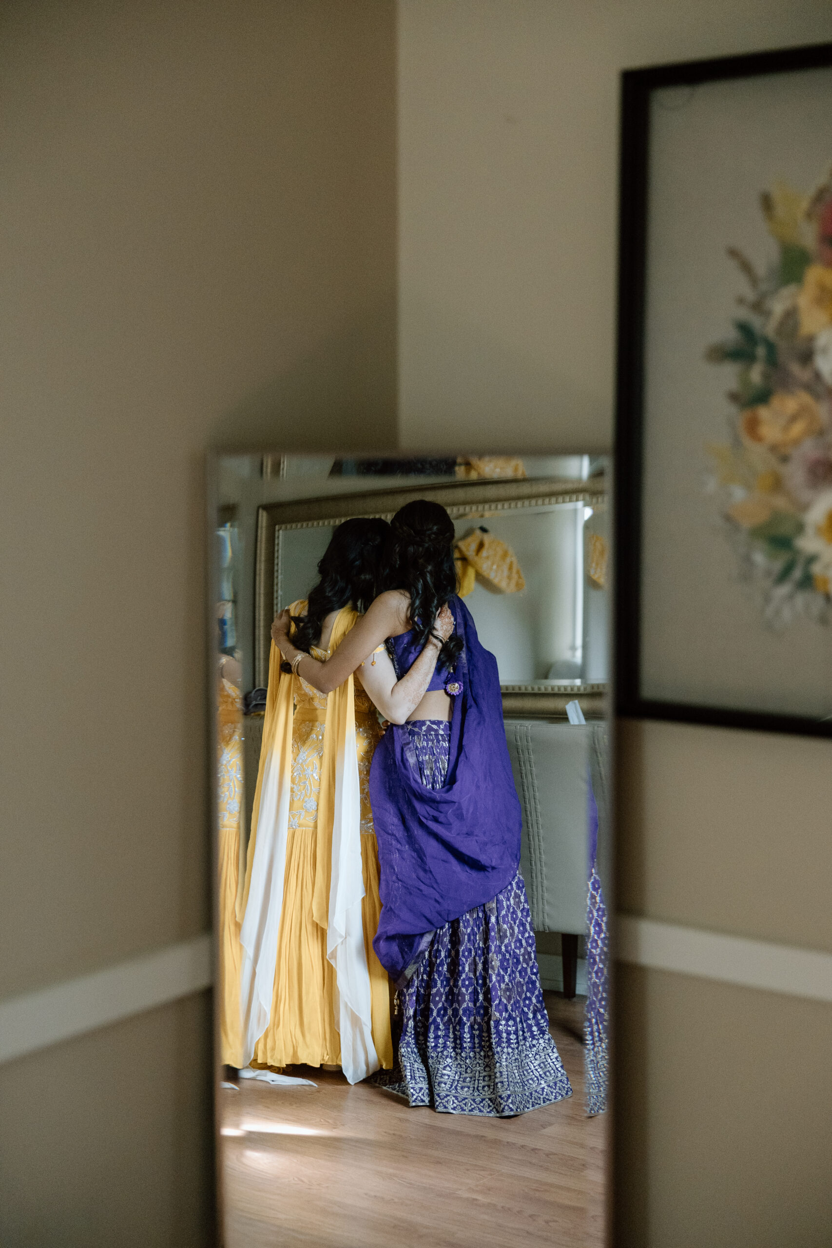 For a two-day Indian wedding at Ashley Ridge, the energy is on a completely different level. Between the choreographed dances, the intricate henna, and the vibrant turmeric ceremony, there is a literal explosion of color and movement at every turn. What made this specific weekend so unique was the sheer size of the creative team – we had a lead photographer, myself, two videographers, and a content creator all working in sync. For the getting ready part of the day, I was there to supplement the story, which allowed me to grab angles like this shot in the mirror of the bride hugging her sister. And below, I had time to slow down my shutter for some fun motion blur.