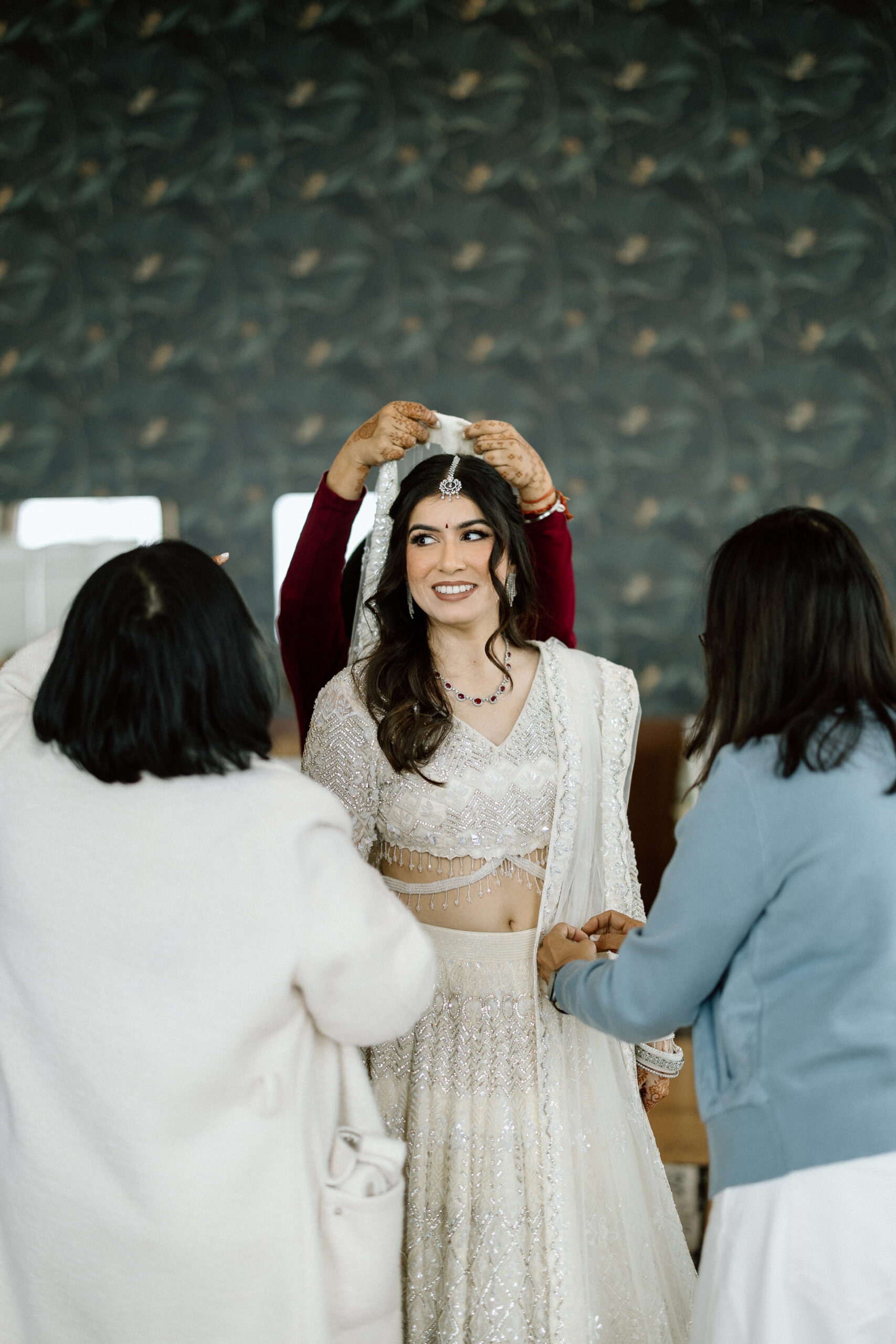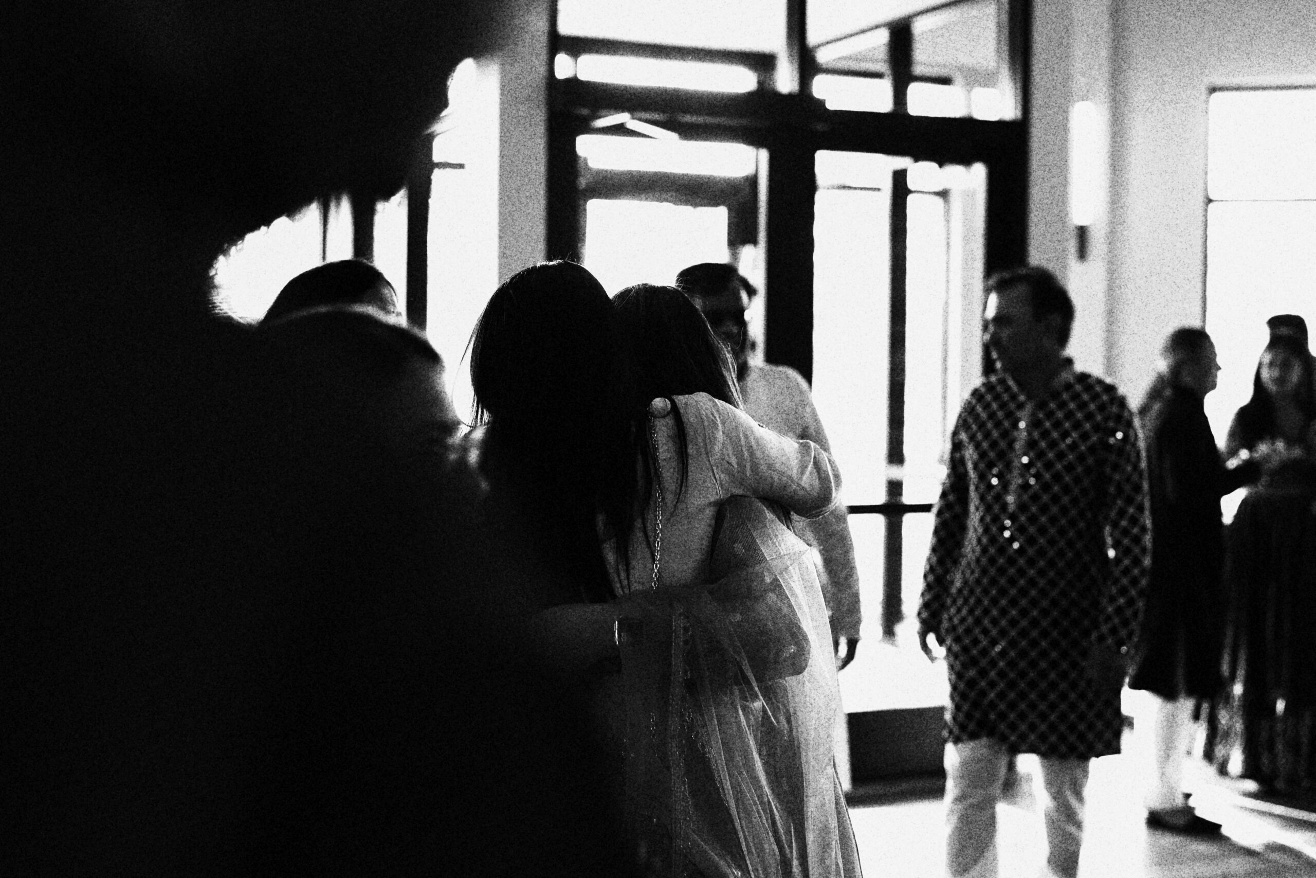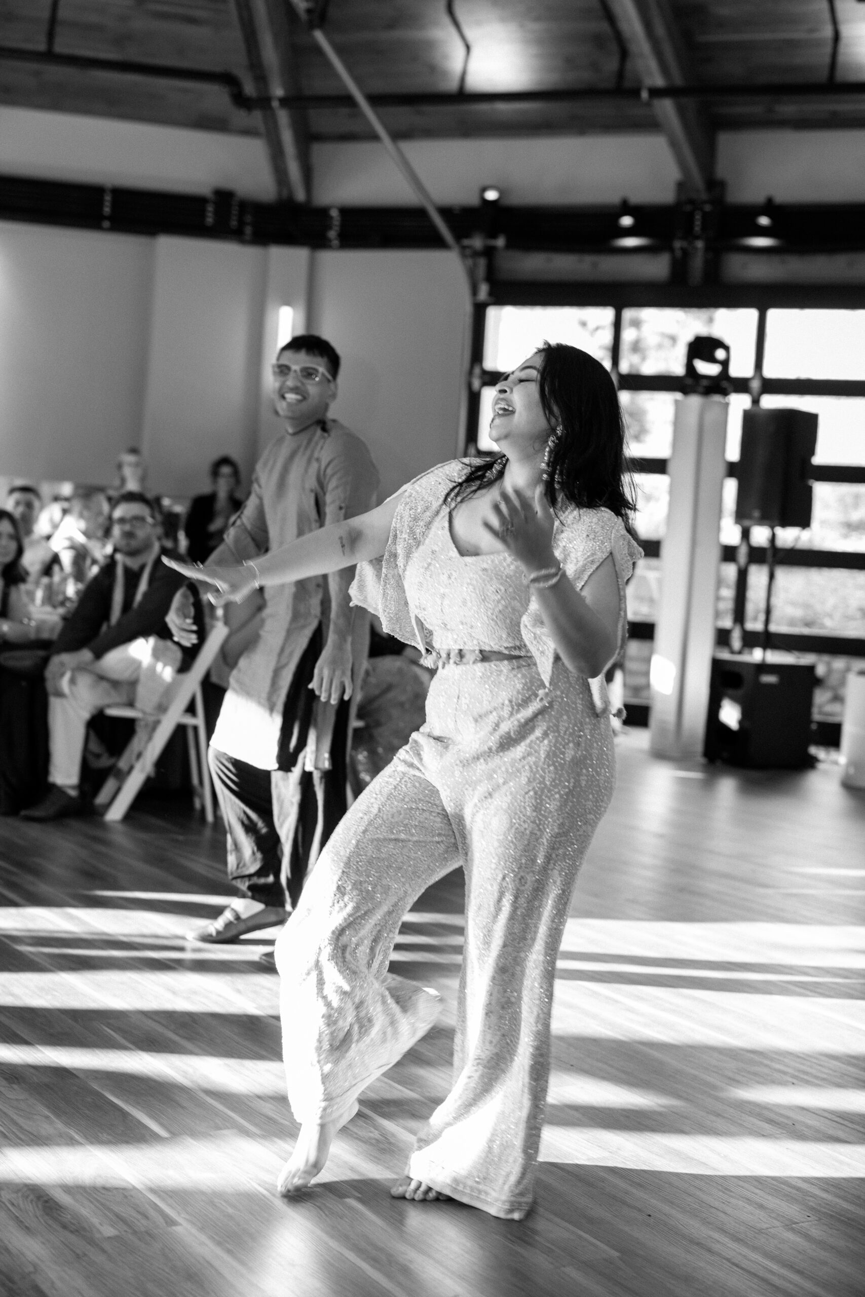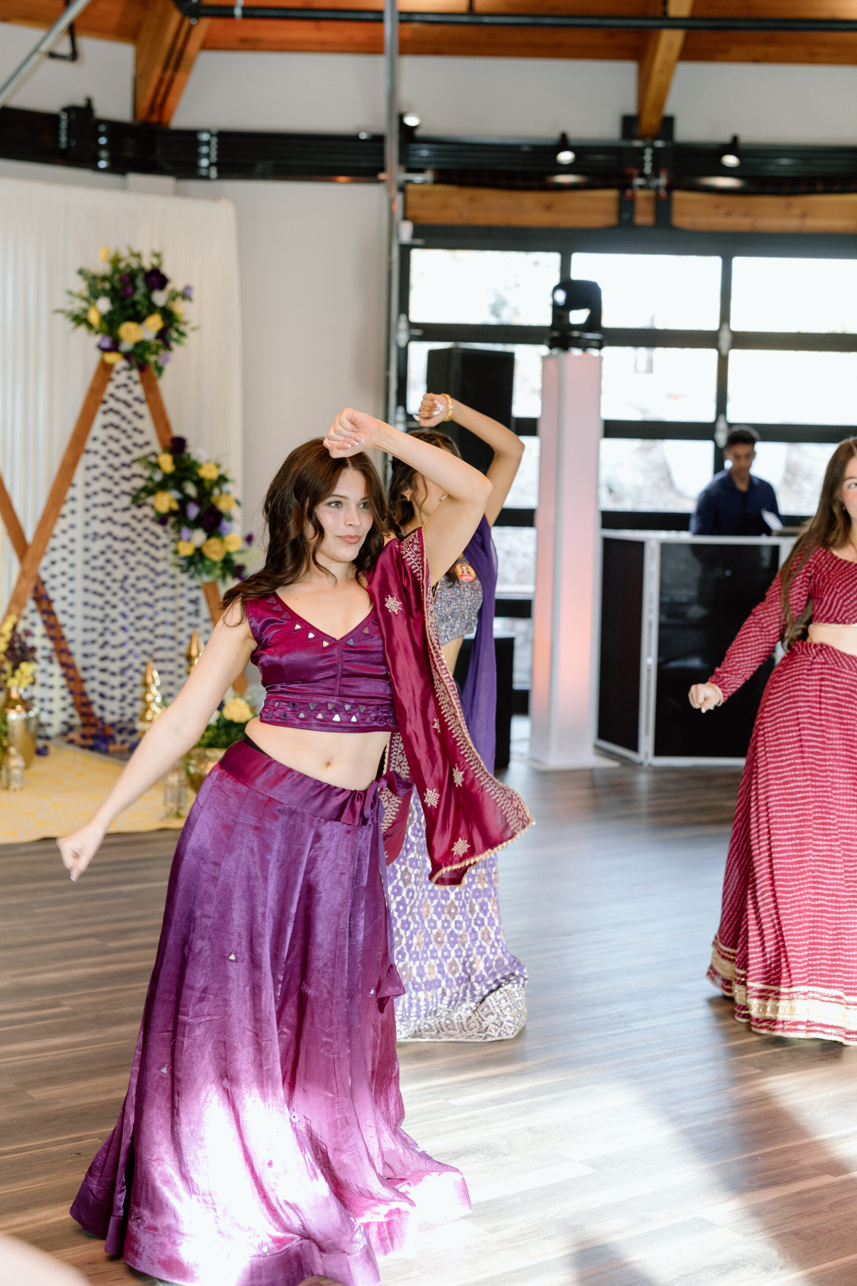 For a two-day Indian wedding at Ashley Ridge, the energy is on a completely different level. Between the choreographed dances, the intricate henna, and the vibrant turmeric ceremony, there is a literal explosion of color and movement at every turn. What made this specific weekend so unique was the sheer size of the creative team – we had a lead photographer, myself, two videographers, and a content creator all working in sync. For the getting ready part of the day, I was there to supplement the story, which allowed me to grab angles like this shot in the mirror of the bride hugging her sister. And below, I had time to slow down my shutter for some fun motion blur.